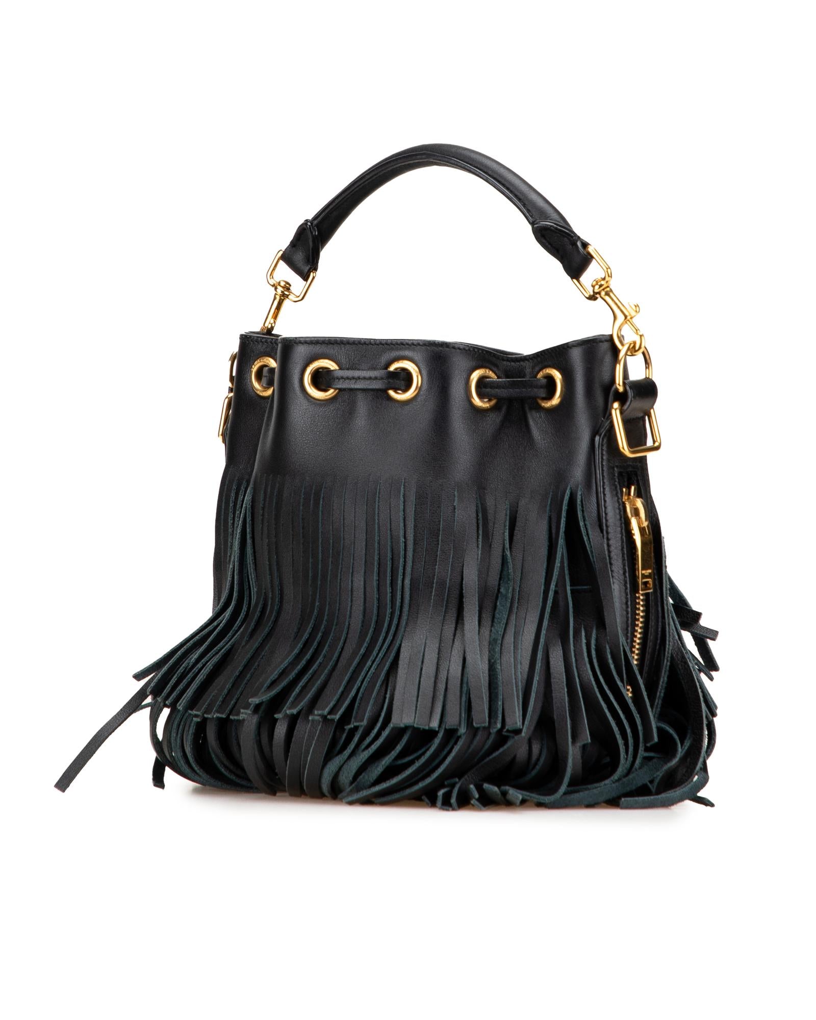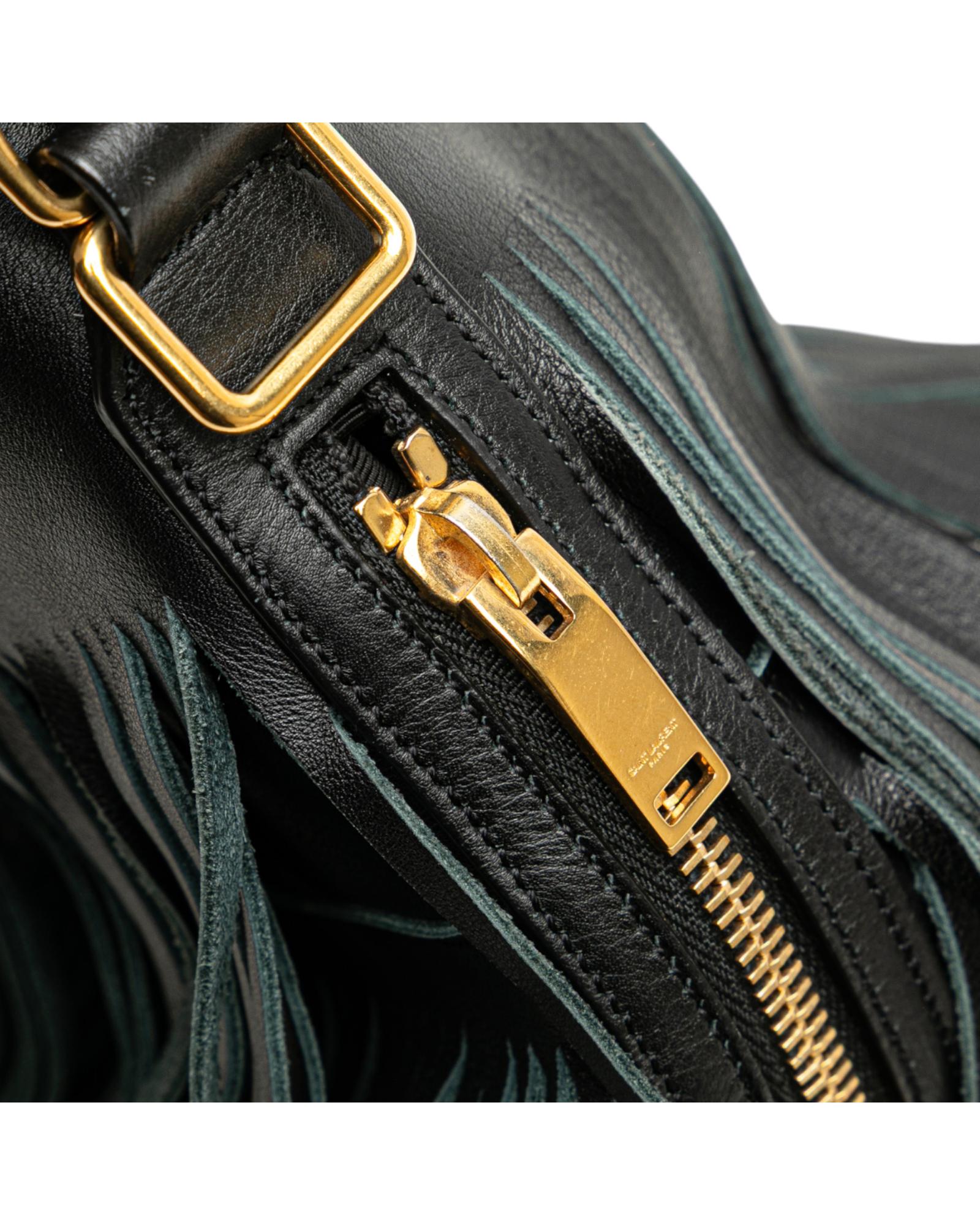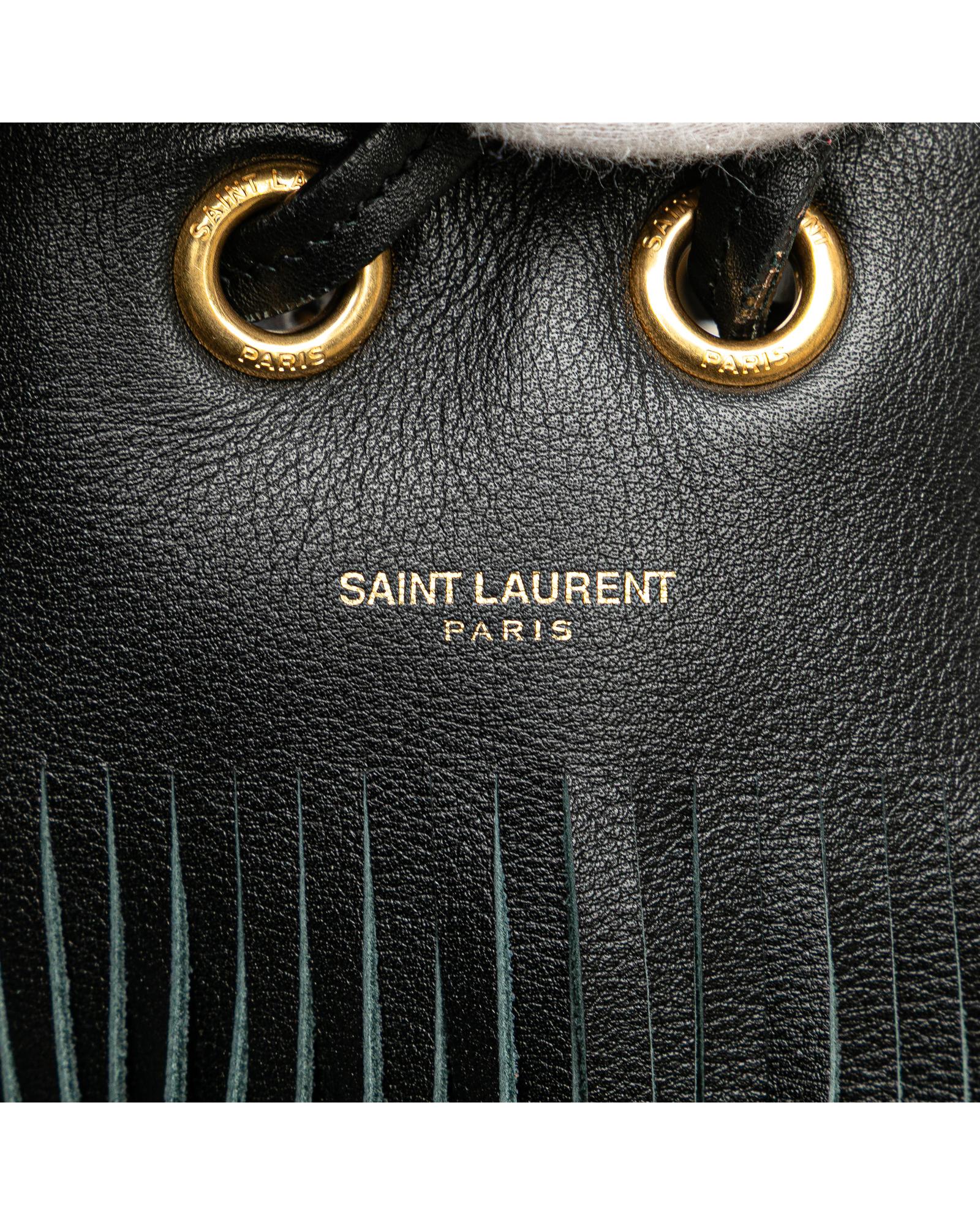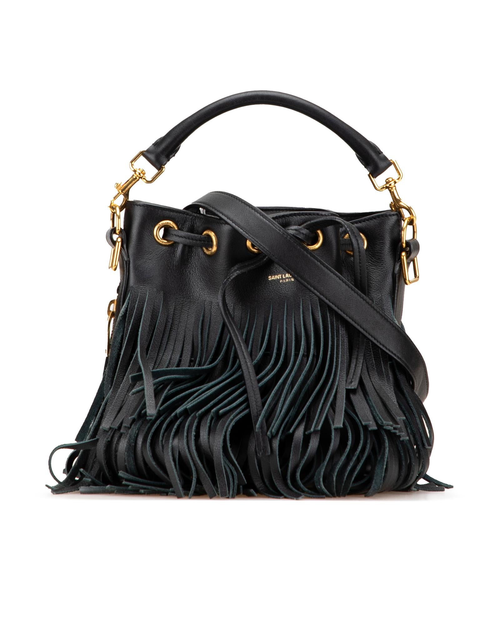 The Emmanuelle features a leather body with fringe details a detachable rolled leather top handle an adjustable shoulder strap and an open top with drawstring closure.Brand: Saint Laurent Vintage