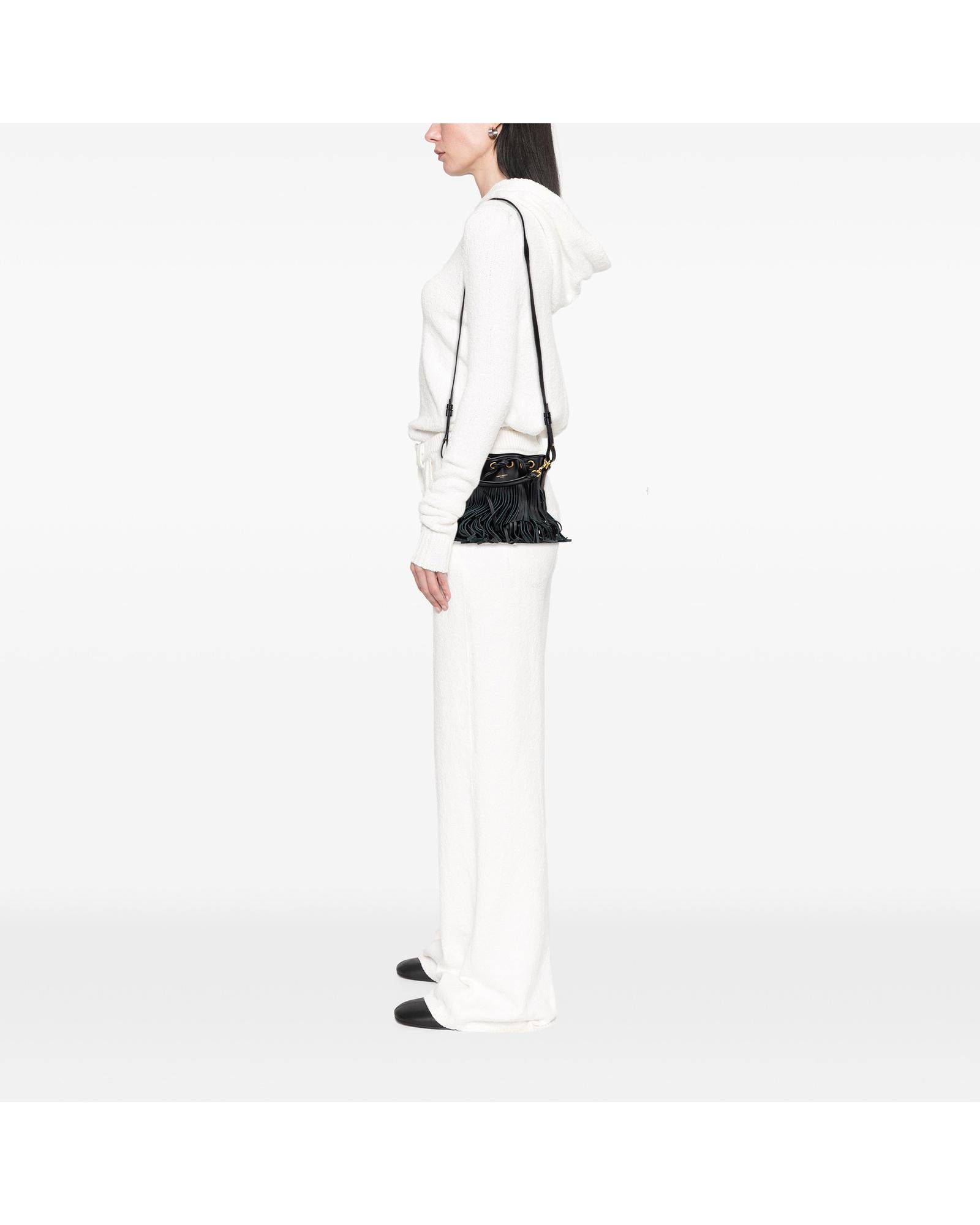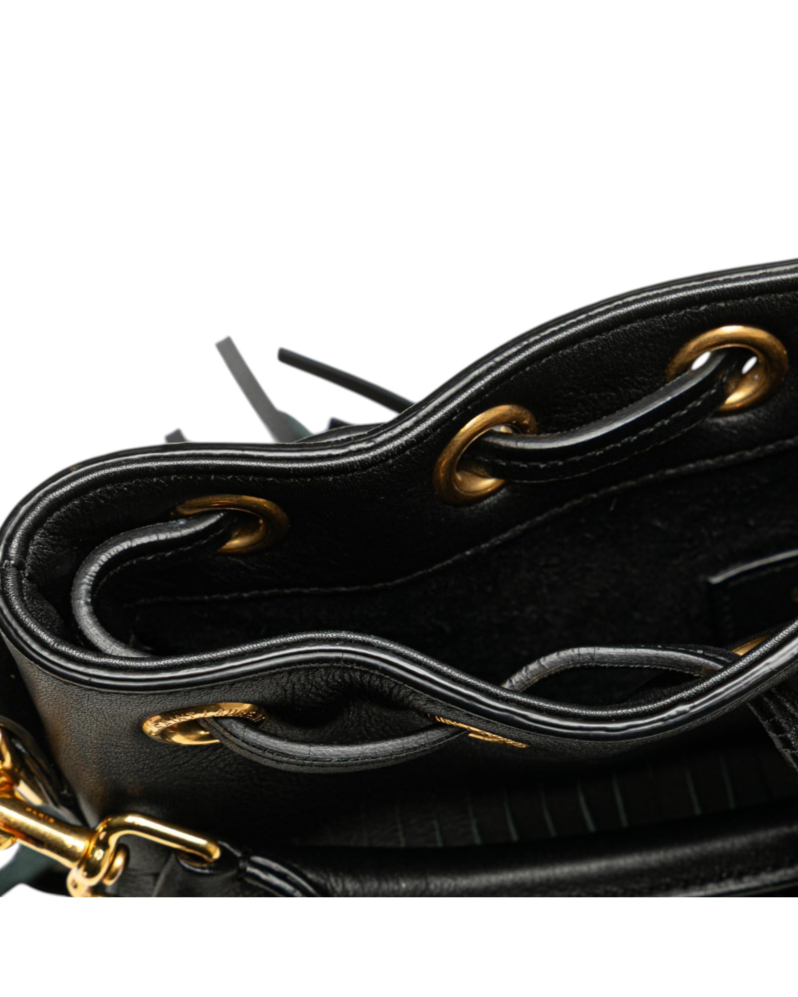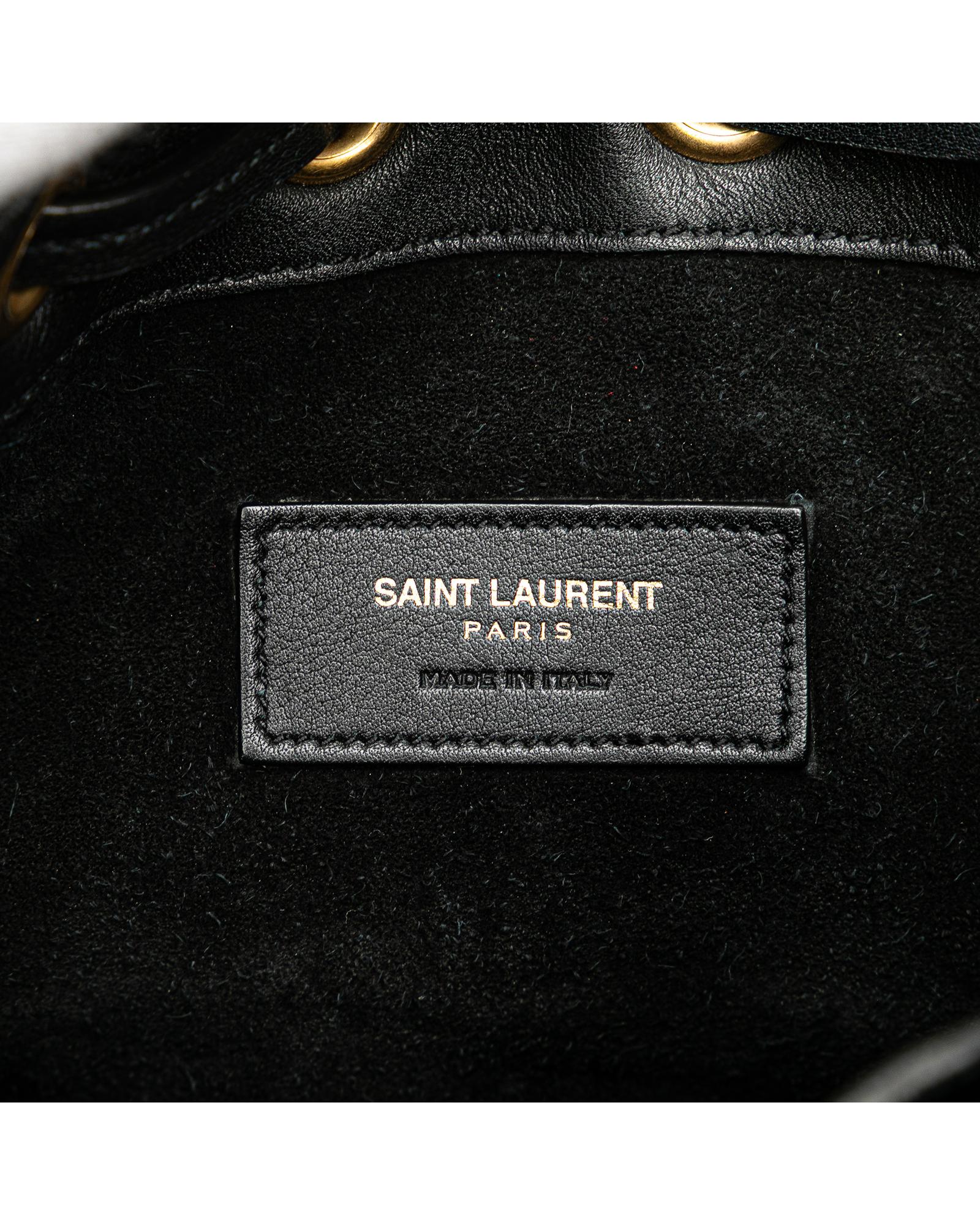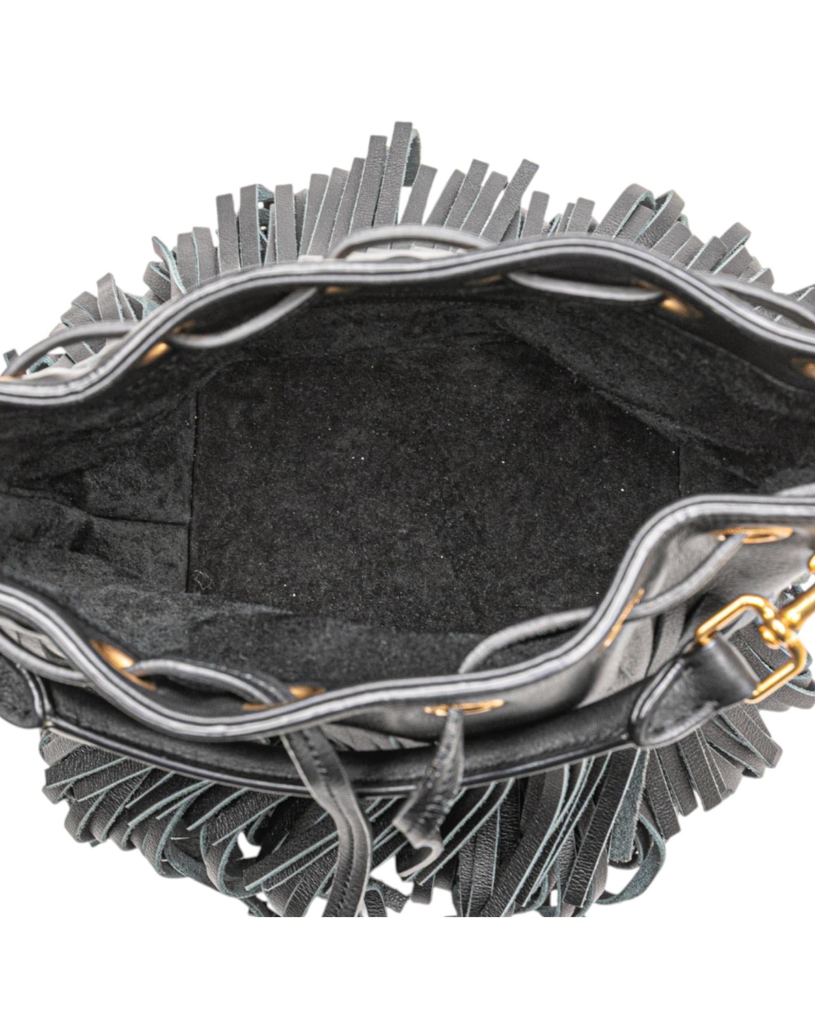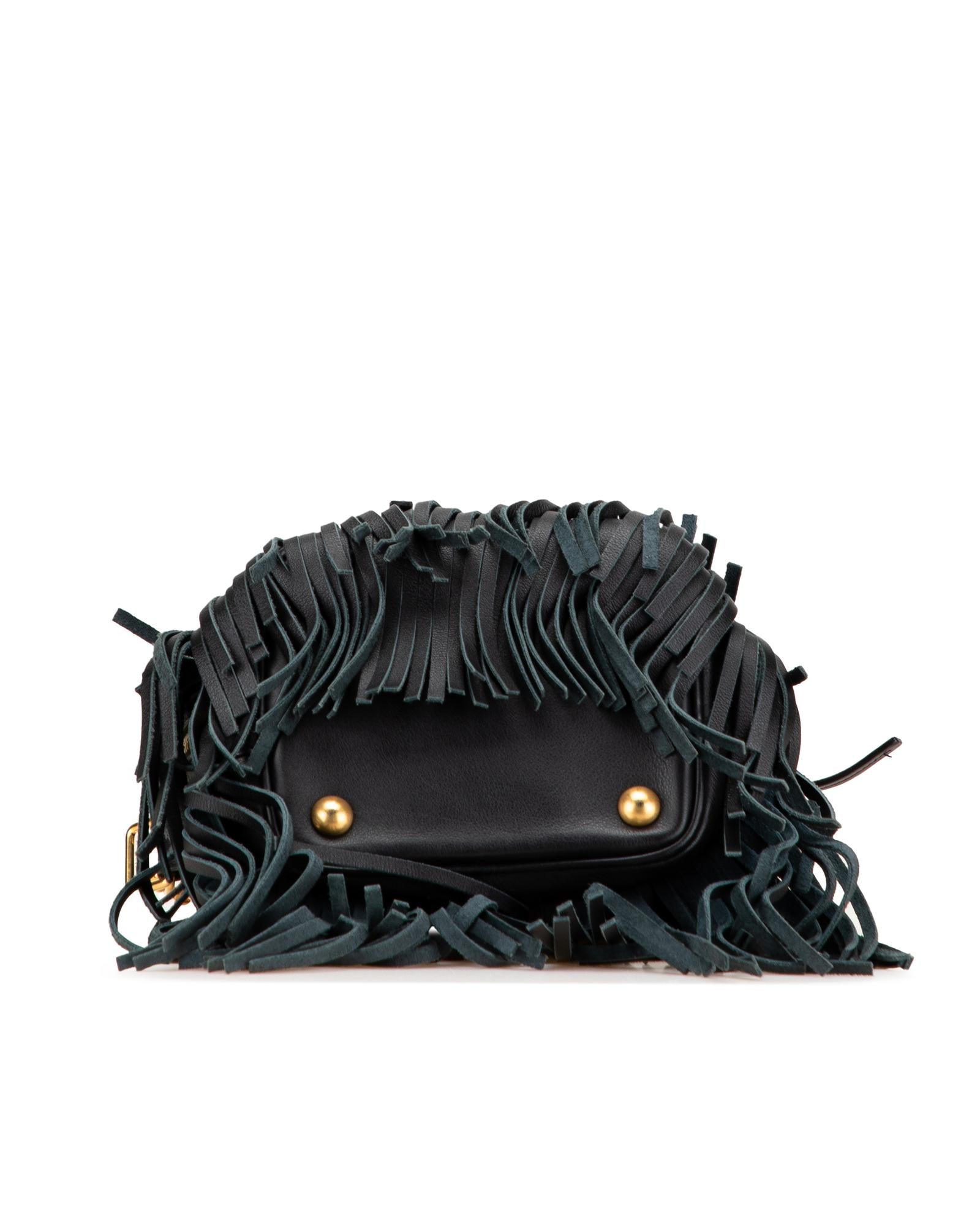 The Emmanuelle features a leather body with fringe details a detachable rolled leather top handle an adjustable shoulder strap and an open top with drawstring closure.Brand: Saint Laurent Vintage